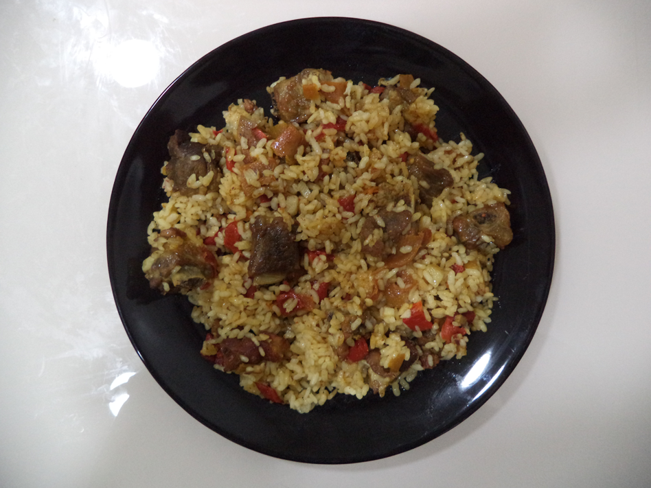 Agregar los pimientos troceados, refreír y sumar la costilla y el arroz.