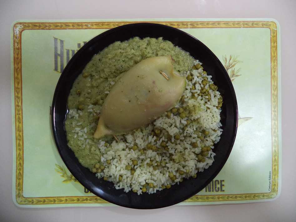 Servir el calamar en el centro, a un lado la salsa y al otro la guarnición de arroz.