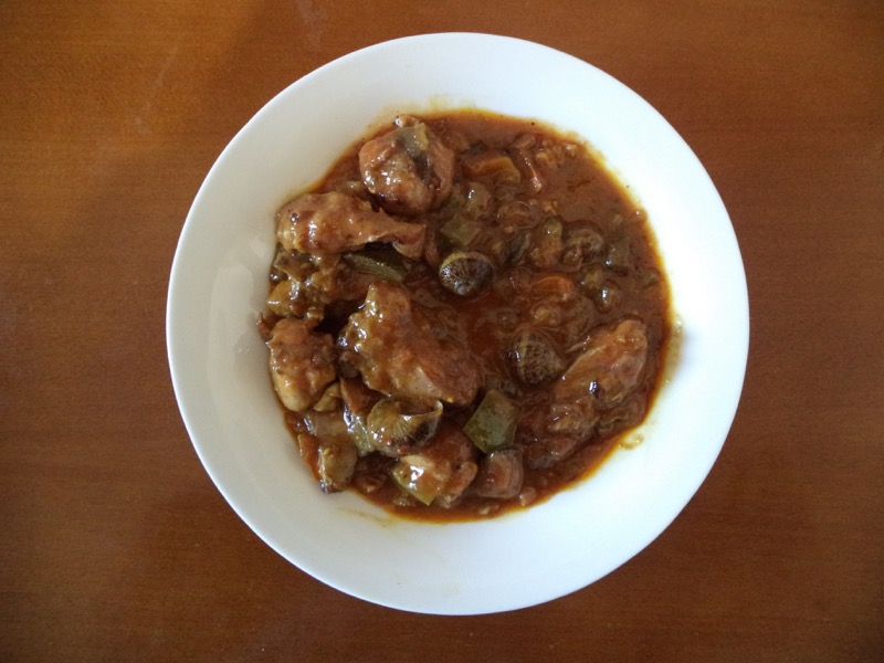 Situar en una olla programable el conejo, los tacos de jamón, las verduras salteadas, la gelatina de la mano de cerdo y las ciruelas pasas deshuesadas y troceadas. Cubrir con el vino, caldo de carne y agregar dos ramas de romero, la cucharilla de cúrcuma y una cucharada sopera de salsa de soja. En una bolsa específica o un cestillo que se situará en la olla, disponer la cebolla, los puerros, las zanahorias y los tomates, limpios y troceados y las ñoras. Cocinar 20 minutos.