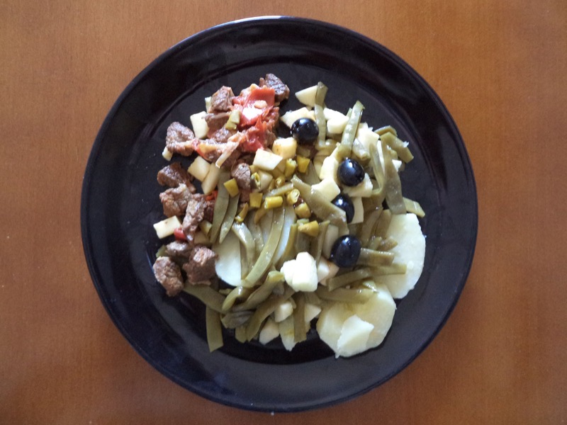 Presentar la ensalada con las patatas cortadas en láminas; las manzanas peladas, descorazonadas y cortadas en tacos, las judías, el maíz, las aceitunas y las guindillas picadas. En el centro o a un lado situar la carne marinada.