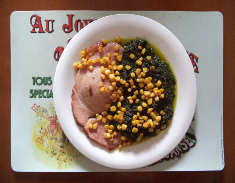 Presentar el filete de lacón con la guarnición de espinacas y el maíz distribuido por encima. Sazonar de considerarlo preciso.