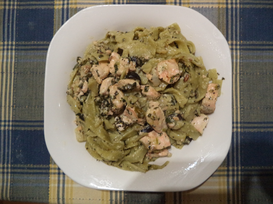 En ese mismo aceite pochar la cebolla y la cayena picadas. Añadir las espinacas secas remover, agregar el salmón y el vino y seguir revolviendo. Sumar la nata, el queso y la albahaca, meneando continuamente. Cocinar unos minutos.