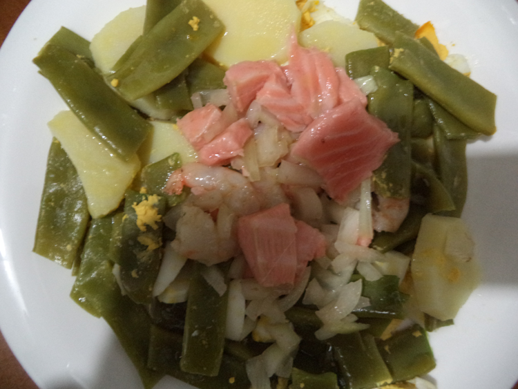 Preparar la ensalada de patatas y judías, picar los huevos duros y situar en el centro el producto marinado escurrido.