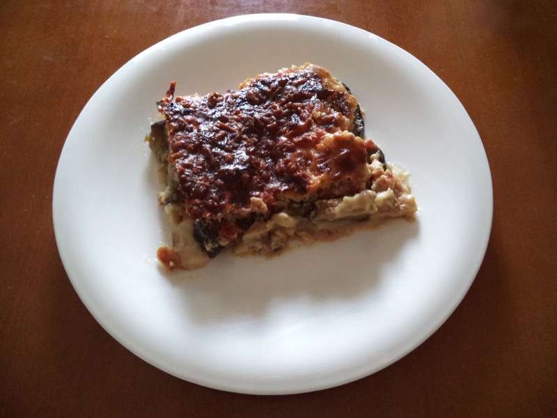 En un molde apropiado para el horno y engrasado, protegido con una lámina especial o papel sulfurizado, colocar la capa de puré de patata, otra de berenjenas, la de carne y finalmente la bechamel.