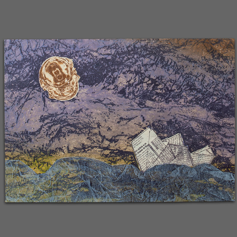 a-4. Calcografía: 2 planchas entintadas en hueco-relieve. 1 tinta litográfica. Papel japón artesanal. Papel y mancha 300x420 mm. Edición: 10, 2 P.A., 1 H.C.