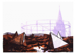 2009 – Ediciones Pata Negra. Carpeta: “Oviedo” Varios autores. S/T. Litografía. 3 plancha, 3 tintas. Papel: SuperAlfa de Guarro-Casas S.A. 250 gr/ m2, 470x340 mm. Mancha: 470x340 mm. Edición: 21.