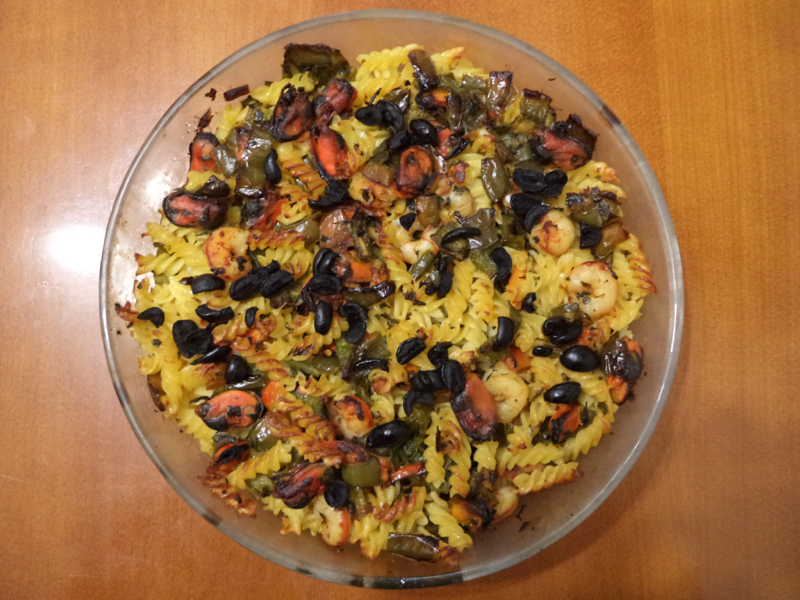 Precalentar el horno a 180 º. En una fuente apta para el horno mezclar la pasta, el refrito de pimientos, mejillones, gambas y aceitunas; agregar el vaso de caldo de mejillones anteriormente apartado y hornear unos 15 minutos.
