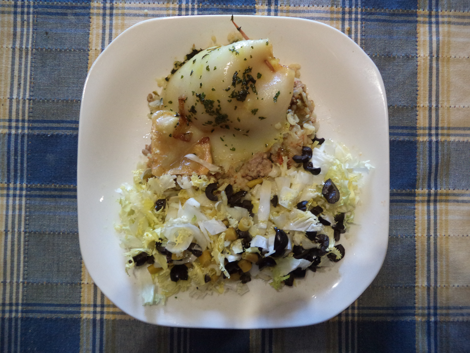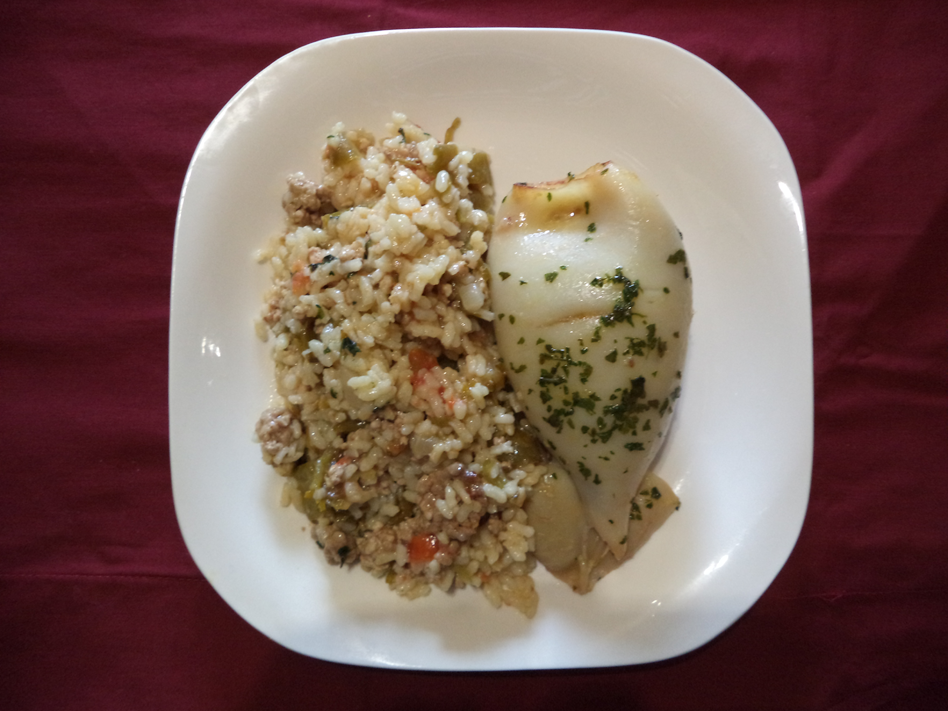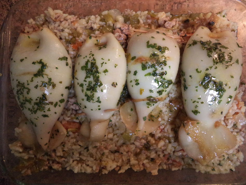 Pota rellena de arroz con carne.Pota rellena de arroz con carne.