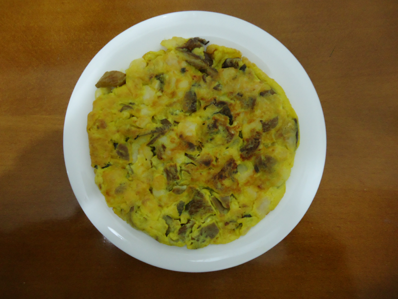 Batir los huevos, añadir el refrito y conformar la tortilla.